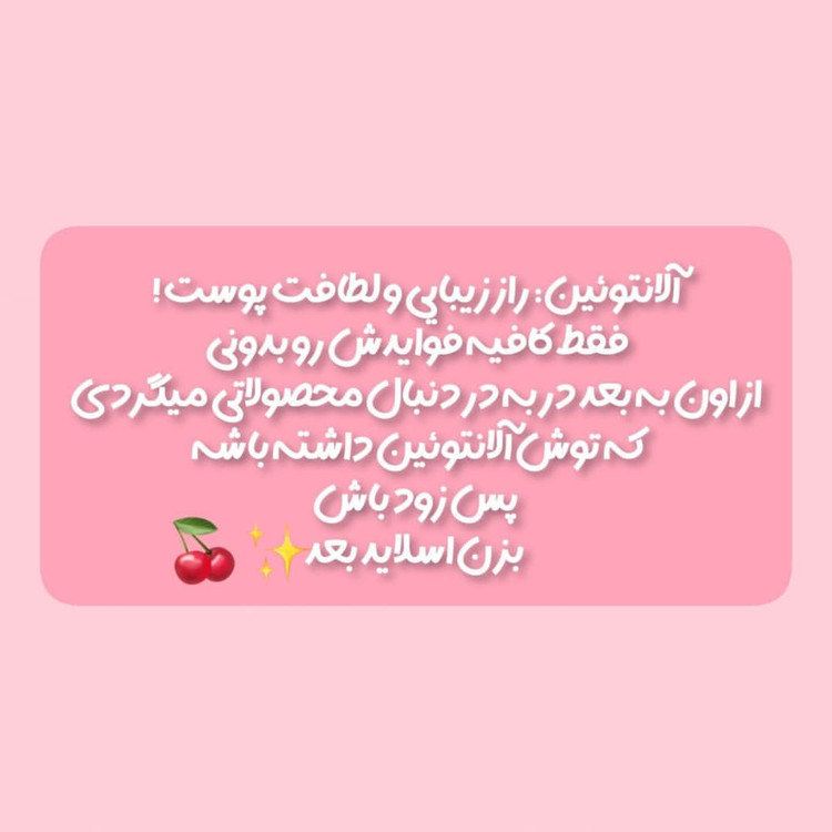 آلانتوئین، مادهای جادویی برای پوست شما! این ترکیب ارزشمند با خاصیت ترمیمکنندگی و آبرسانی عمیق، به پوست کمک میکند تا نرم، صاف و لطیف بماند. آلانتوئین نه تنها قرمزی و التهابات پوستی را کاهش میدهد، بلکه یک محافظ عالی برای پوستهای حساس است. اگر به دنبال محصولی با این ویژگیهای شگفتانگیز هستید، کرم لینتینگ لاکچری کویین انتخابی بینظیر است کرم لاکچری با ترکیبات خاص خود از جمله آلانتوئین، به پوست شما طراوت و شادابی میبخشد و آن را از درون تغذیه میکند. با کرم لینتینگ کویین، پوستی همچون ملکهها داشته باشید! . . . @skin_zy1 @skin_zy1 #سلامتی#پوست #زرد #خطوط#